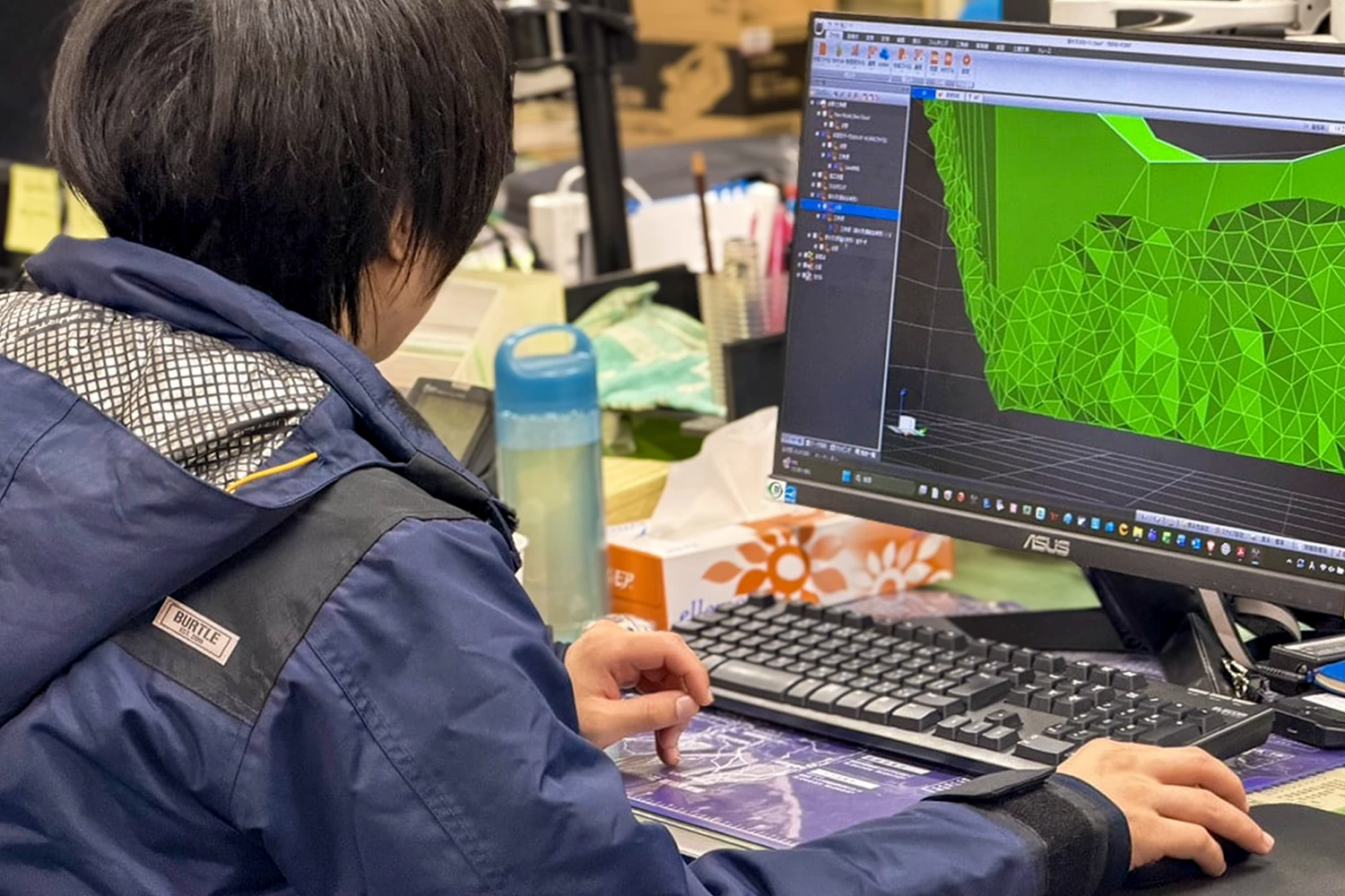 土木・舗装・治山工事など、建設ICTを導入し、作業の効率化と施工の省力化・最適化を進めています。工法の機械化・自動化から施工管理、安全、環境分野まで、現場全体のDXを推進しています。