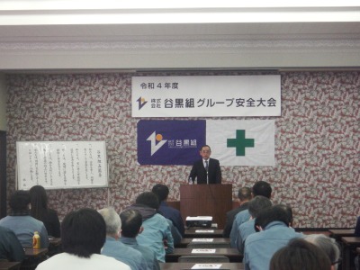 冬季安全大会(2023年)を実施しました 2023年2月17日 2023年2月17日に谷黒組グループ冬季安全大会【2023】を開催しました。本大会では栃木県那須塩原警察署様に【冬季における交通事故防止】、橋爪労働安全コンサルタント事務所 橋爪良行様に【安全衛生管理の実態と今後の課題】のご講義をいただきました。谷黒組では、安全教育を定期的に行い、安全意識の向上に努め、顧客・地域社会・従業員の「安全と安心」を守る取り組みを行ってまいります。