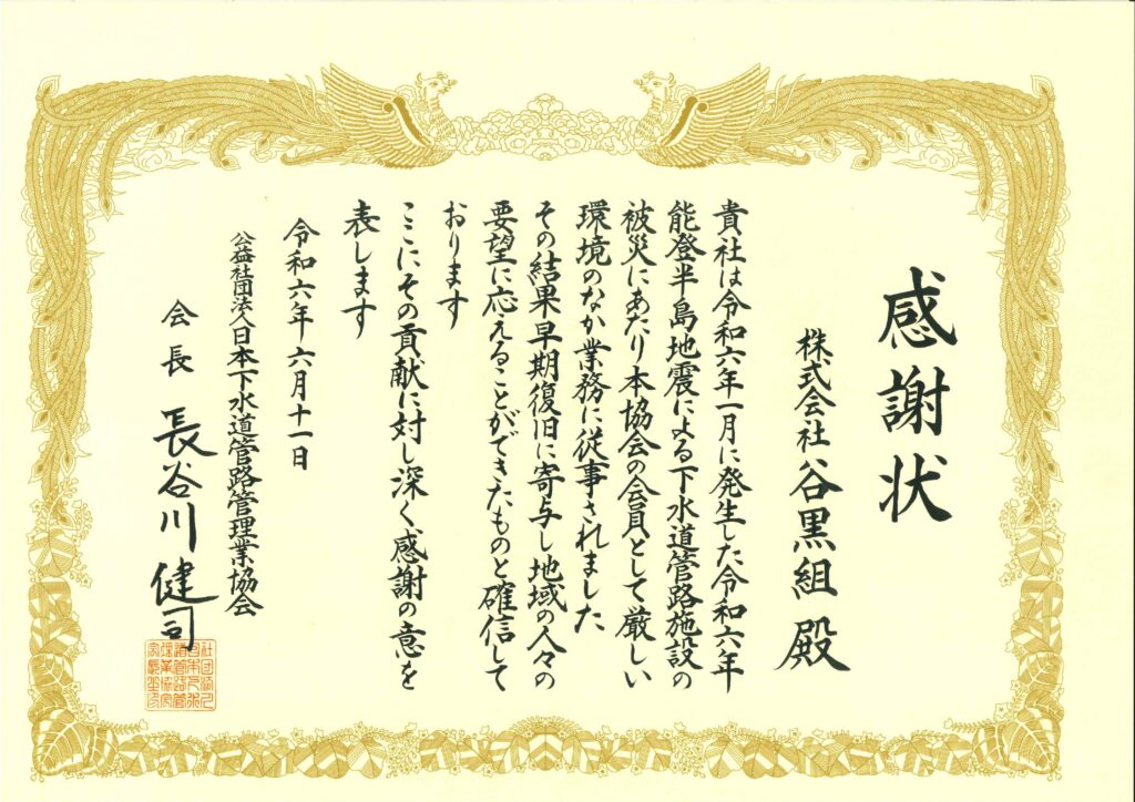 日本下水道管路管理業協会より感謝状をいただきました 2024年6月12日 2024年6月11日、当社が2024年1月に発生した能登半島地震による下水道管路施設の災害復旧に貢献したとして日本下水道管路管理業協会より感謝状をいただきました。これを励みに今後も人々の安全な暮らしと安心な社会を守る企業としての責務を果たして参ります。